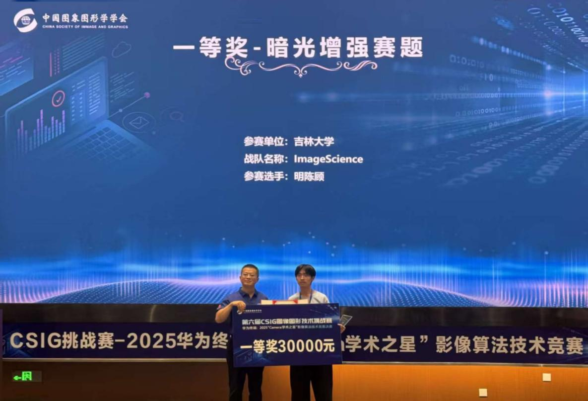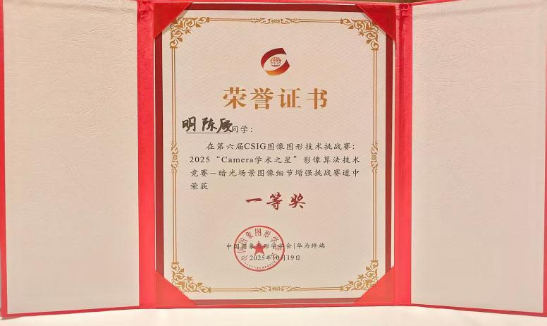 研一学生明陈顾作为单人队伍,展现出扎实的专业基础和出色的创新能力,荣获暗光场景图像细节增强赛道一等奖(第一名,奖金30000人民币),指导教师为查志远教授。