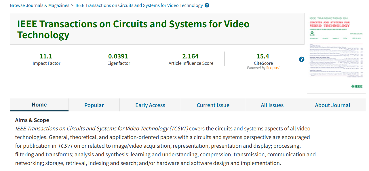 IEEE Transactions on Circuits and Systems for Video Technology(简称IEEE TCSVT)是IEEE旗下视频技术领域的顶级学术期刊之一,最新影响因子为11.1,入选中科院一区TOP期刊。该刊主要发表图像与视频信号的采集与表示、处理与变换、分析与理解、压缩与传输以及硬件/软件系统设计与实现等方面的高水平研究成果,在国际学术界具有重要影响力。