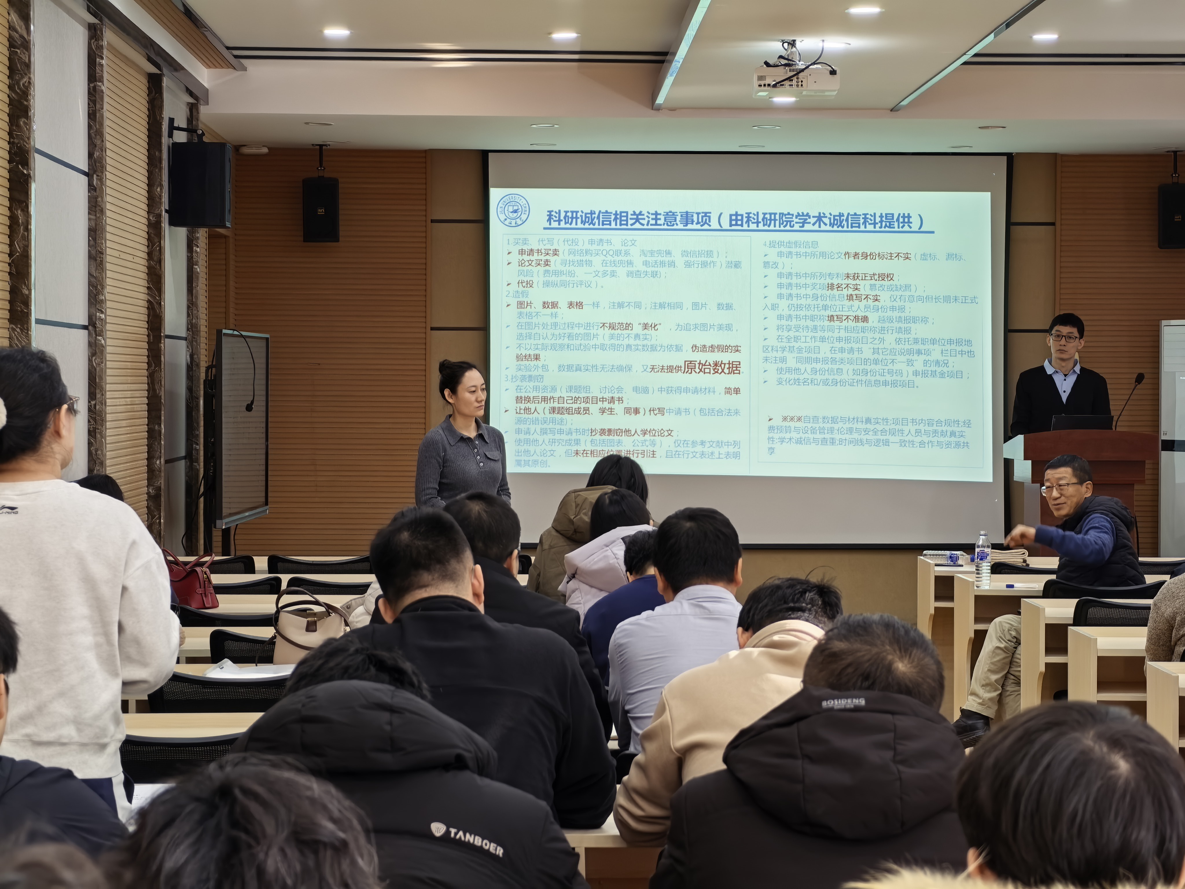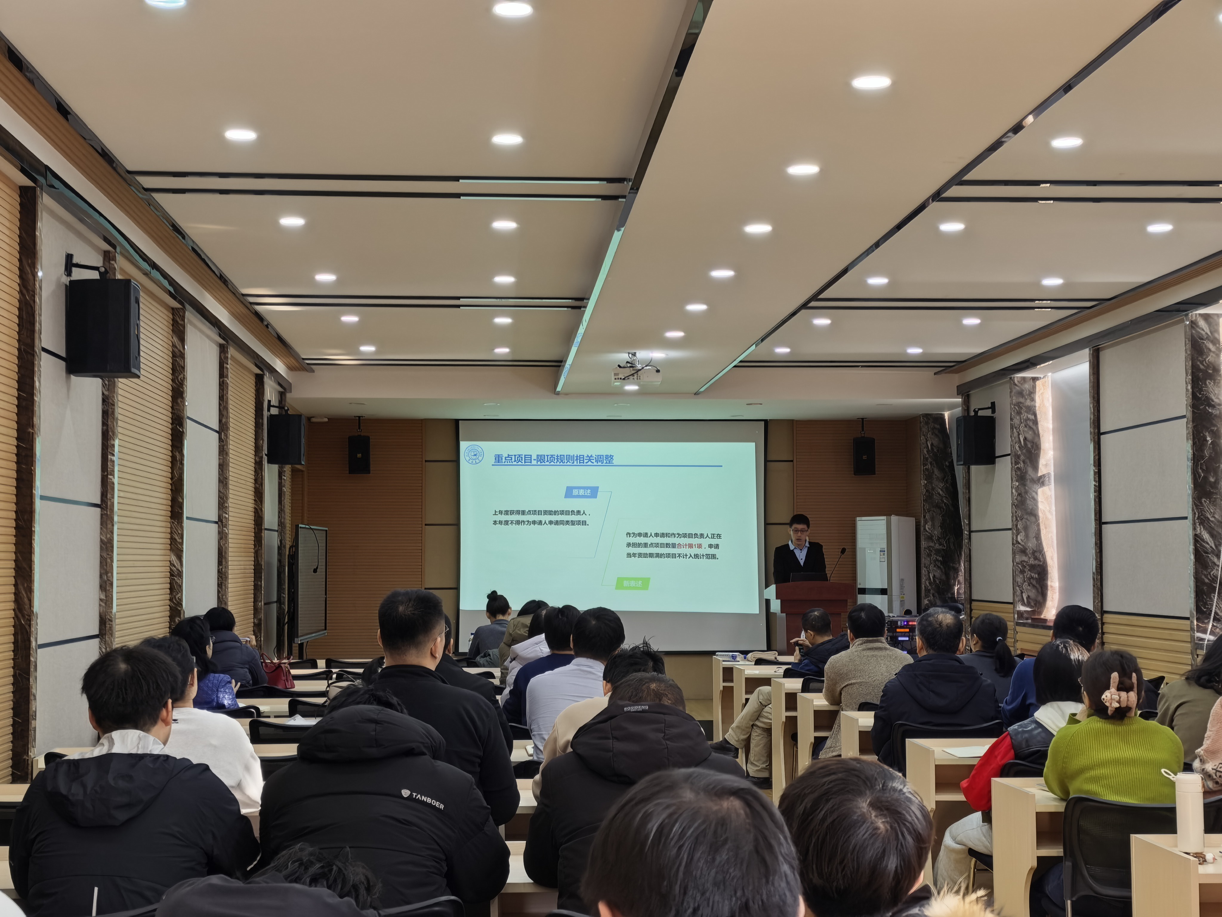 朱明老师围绕2025年度基金申报与资助情况、2026年度基金工作安排及改革要点等方面展开系统讲解。他详细分析了2025年度全国及我校基金申请与立项数据,指出我校平均资助率高于全国平均水平,尤其在青年人才项目上取得历史性突破。针对2026年度申报,朱明重点介绍了申请书结构优化、人工智能使用规范、代表作贡献填报、科研诚信自查等新要求,并对申报时间节点、材料准备、常见问题等作了细致说明。