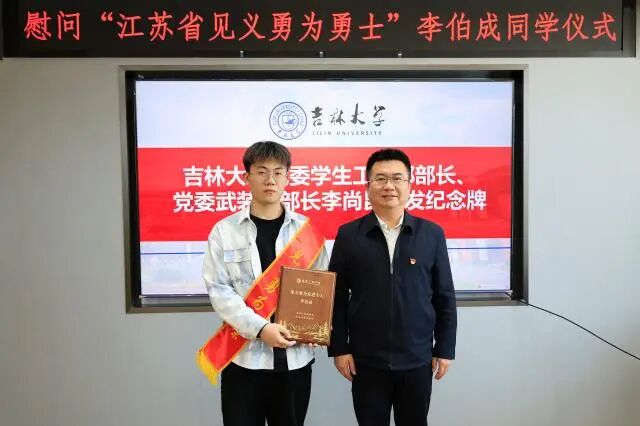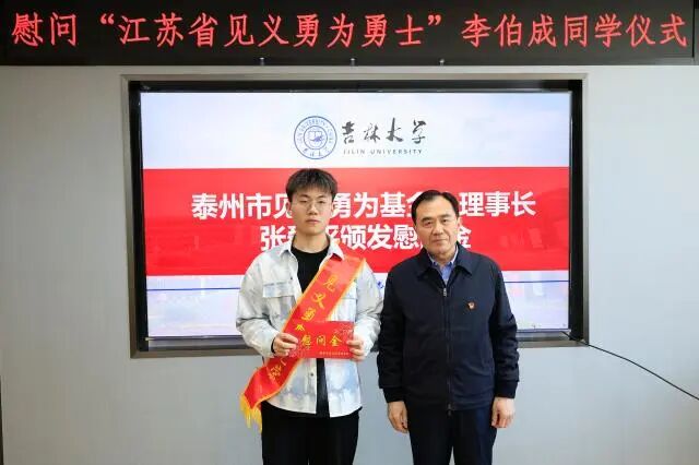 2023级本科生李伯成同学。江苏省见义勇为基金会理事长弘强、吉林省委政法委一级巡视员李光辉、吉林大学党委副书记丁世海出席慰问仪式。仪式由足球投注平台