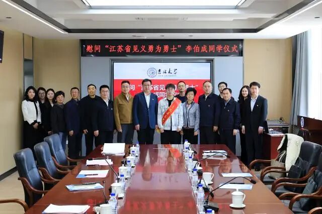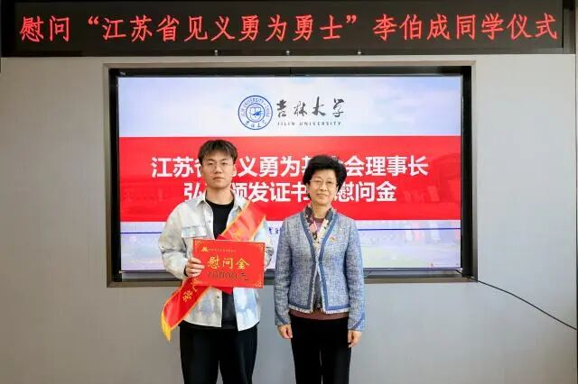 弘强表示,李伯成见义勇为的善举彰显了新时代大学生的责任与担当,此行既是给予肯定,更是要在全社会弘扬正气,树立鲜明导向。她指出,这次看似偶然的见义勇为,离不开吉林大学长期坚持“价值塑造、能力培养、知识传授”三位一体的育人理念,是学校久久为功的结果。希望苏吉两省加强交流合作,共同推进见义勇为事业发展,勉励李伯成不负厚望,以实际行动书写无愧于时代的青春华章。